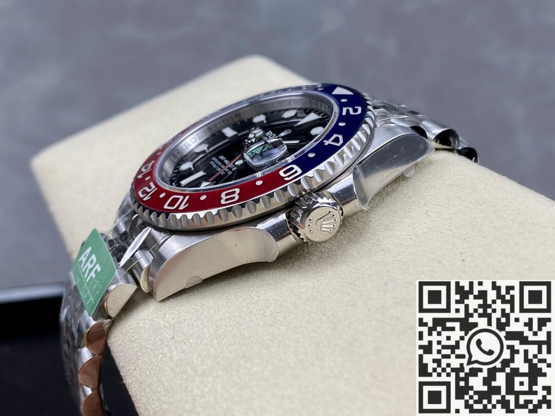 The upgraded ARF Rolex GMT Master II replica is meticulously crafted from 904L stainless steel, showcasing precision and durability. The ceramic bezel insert with platinum-coated numerals seamlessly integrates with the design, maintaining the authenticity of the original timepiece.