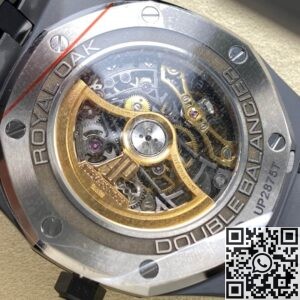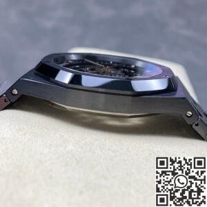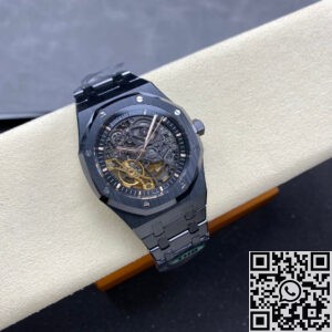 The replica features a high-grade skeletonized automatic movement, carefully crafted to resemble the Calibre 3132 used in the genuine Royal Oak Double Balance Wheel Openworked. The movement is visible from both the front and caseback, showcasing the dual balance wheels and beautiful Geneva stripes, delivering both performance and artistry.