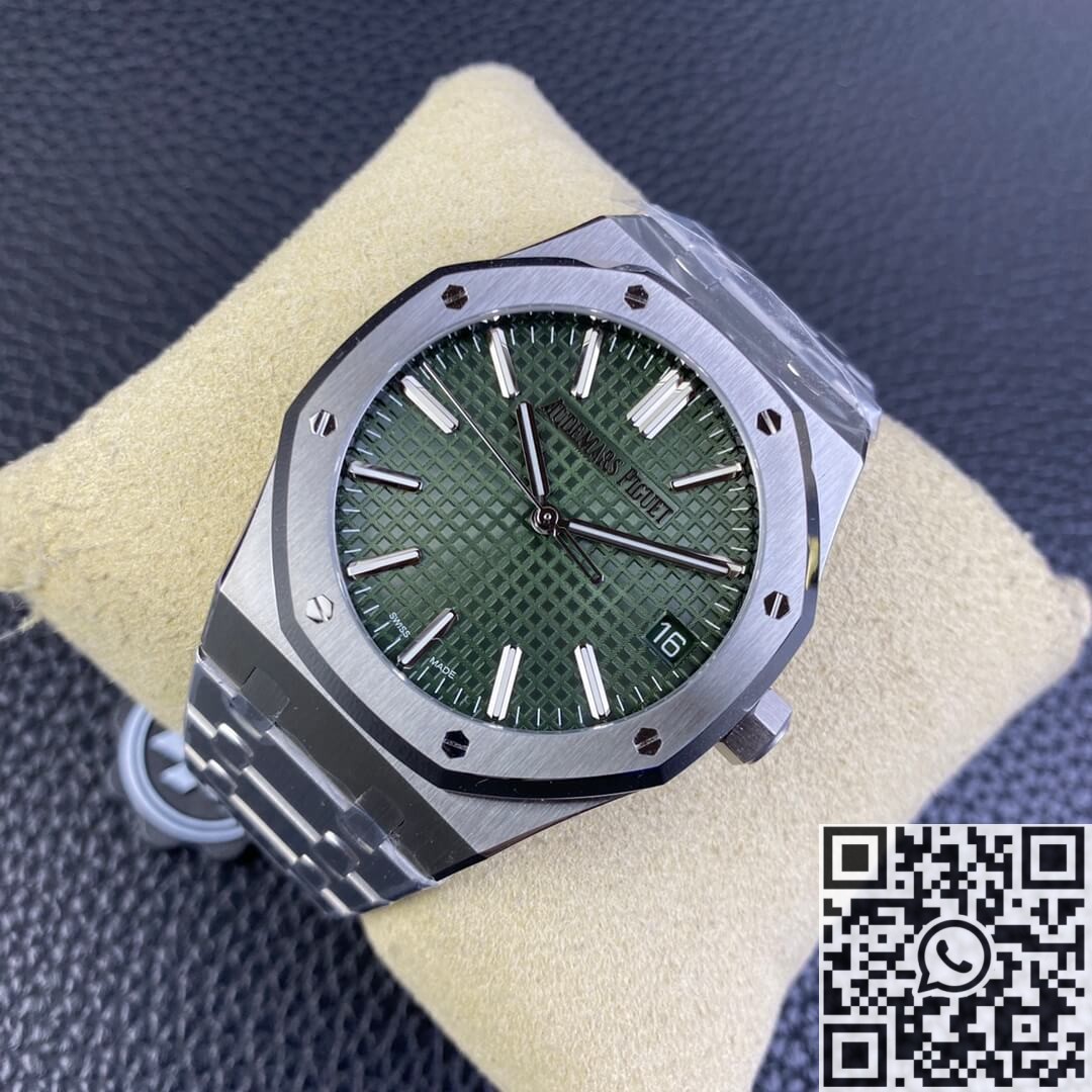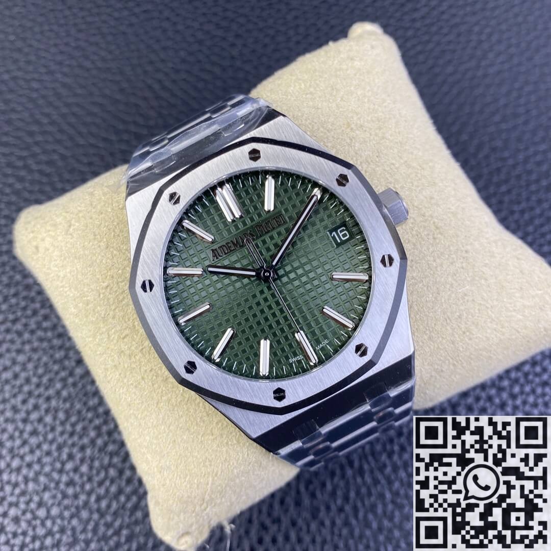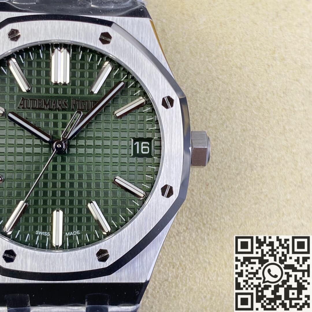 2. Army Green Dial: The distinctive Army Green dial adds a modern twist to the classic Royal Oak aesthetic, offering a unique and sophisticated color variation. The “Grande Tapisserie” pattern enhances visibility and lends a textured allure to the timepiece.